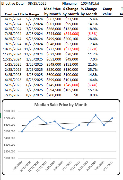 How the appraiser analyzes the market can make all the difference in the appraised value. Are they describing the market in a way that makes sense in the real world of buyers and sellers? Are they including enough sales in that analysis so that they can report accurate price trends in a given area? How are they reporting that information and developing date of sale adjustments? In that vein, here are some graphs from an analysis I just completed of the North Springs High School District. Every figure in this graph represents a quarterly median where the price noted is the median from the last 3 months. That's quite a jump in the last quarter! It definitely points to this market showing significant increases, but would it make sense to make a 15.6% increasing date of sale adjustment to a sale from April? That's $124,800 for an $800,000 home! Above is the monthly median using the same sales. Fannie Mae used a monthly trend in their recent announcement about including date of sale adjustments in appraisal reports. I tend to avoid this approach because, in my experience, these figures can fluctuate wildly. For instance, here you could claim a 15% positive adjustment for a sale a month ago, but at the same time include a 6% negative adjustment for a sale from 2 months ago. What the?!?! Which brings us to the G.O.A.T., the most bestest way of analyzing the market and translating this data to the real world: Rolling Median. Rolling median is an analysis where each figure represents the median price in the area for the previous 12 months. It can provide a better continuous view of how the median is evolving over time, make it easier to spot gradual changes or patterns, and it can give you more stable estimates with less influence from data outliers. In this case that is still a pretty hefty adjustment from 3 months ago: 5.4% which translates to $43,200 for an $800,000 home. But it would seem that amount is more than justified if you look at the quarterly trends. It seems like back in the day (I'm talking early 2000's here - re-fi boom time) almost all appraisers put "stable" for the market and left it at that. That's what my supervisor trained me to do. But several declining markets, and 3% interest rates and god knows what's happening now later it does seem that meaningful market analysis in the appraisal world, for one thing, has generally changed for the better. If you can't properly describe the market and properly analyze it you probably (uh, definitely) are going to fall short in coming up with a meaningful appraisal. If you as an agent get an appraisal where the market analysis falls short and the appraised value falls short, start your rebuttal with the Neighborhood section of the report and any other errors you can find before getting to the comps. You may find that the appraiser made a series of errors which is a big no-no in the appraisal world (USPAP Standard Rule 1-1(c) states that an appraiser must not render appraisal services in a careless or negligent manner. This includes avoiding a series of errors that, while minor individually, can, in the aggregate, undermine the credibility of the appraisal results.)